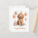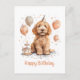 Mignonne illustration de dessin animé de chien Goldendoodle portant un chapeau d'anniversaire avec un gâteau d'anniversaire et des ballons. Parfait pour les amoureux des animaux ou les parents de chiens.