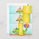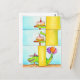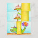 Cette carte se décline en trois vignettes de dessin animé. La première montre un pilier jaune sur un fond bleu ciel. À gauche du pilier, un gâteau est posé sur une petite table. Le gâteau est fait de mousse jaune, avec une garniture au chocolat et un glaçage rose. Sur celui-ci, une bougie d'anniversaire rouge est allumée. Une petite mâchoire inférieure verte s'étend derrière le pilier et en direction du gâteau. Dans la deuxième vignette, la mâchoire supérieure se referme vers la mâchoire inférieure. Elle va se refermer sur le gâteau.