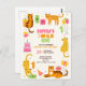 Cette conception présente des tigres et des léopards illustrés, parmi des ballons colorés, des cadeaux d'anniversaire et des chapeaux de fête associés à une typographie moderne. Tout le texte sur cette invitation d'anniversaire est modifiable. Trouvez des articles assortis dans ma boutique.