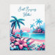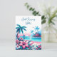 Art pixelisé qui ressemble à du point de broderie représentant une image d'un océan bleu, de palmiers et de fleurs tropicales roses. Joyeux Anniversaire.