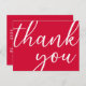 Un fond rouge cerise vibrant. Sur le devant, une grande écriture manuscrite avec le texte : Merci. Dos : Modèle pour votre note de remerciement et nom/noms. Astuce : Si vous ne voulez pas que cela ressemble à une carte postale, cliquez sur personnaliser, allez au dos et supprimez le séparateur et le timbre-poste.