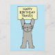 Dessin d'un chat gris moelleux tenant une pancarte couleur citron qui dit "Joyeux Travis d'anniversaire".