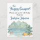 Motif d'anniversaire "One Happy Camper" dans les montagnes rustiques et le camping. Parfait pour l'invité d'honneur qui aime l'aventure et le camping! Le design est une aquarelle avec montagnes, lac, tente et cerf et texte amusant. Modifiez les informations de la partie au verso.