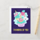 Pensez à votre carte postale avec une jolie illustration représentant un cupcake et une crème glacée souriant avec joie. Un arc-en-ciel et des coeurs entourent le dessin. Un mignon nuage moelleux est aussi souriant avec bonheur. Le cupcake et la crème glacée ont également une corne de licorne branchée sur le dessus. Design mignon et adorable, plein de joie.