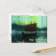 Une image légèrement stylisée d'un longship viking naviguant la nuit sous les aurores boréales, il y a quelques icebergs; la plupart de l'équipage est endormi. Le texte français "Joyeux Noё l" apparaît en bleu et blanc éclatant. Ajoutez votre propre texte supplémentaire.