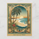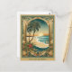 Cette carte postale tropicale de Noël a une image de style Art nouveau traditionnel d'une arche dorée avec un palmier, une plage et un beau coucher de soleil. Tous les textes peuvent être customisés selon vos besoins.