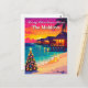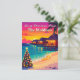 Envoyez vos vœux chaleureux de Noël depuis le paradis ! Cette carte postale représente un coucher de soleil tropical lumineux, des bungalows sur pilotis et un arbre de Noël festif sur la plage — la touche tropicale parfaite pour les fêtes.