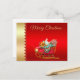 Elégante carte postale avec un traîneau Père Noël avec des cadeaux colorés sur arrière - plan rouge, avec des coeurs romantiques sur arrière - plan or, avec texte...Joyeux Noël. Vous pouvez facilement personnaliser avec votre choix de texte.