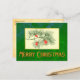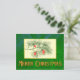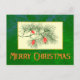 Cartes postales Joyeuses de Noël avec des lettres de script élégantes dans les marron et l'art de Noël ou de Noël Illustration vintage d'une touffe de pin en vert avec des cônes de pin rouge à l'intérieur d'un cadre doré sur un arrière - plan vert de forêt avec un motif de pin bleu et vert. Cliquez sur Customiser pour modifier les polices, dimensionner et plus encore, même enregistrer votre conception pour plus tard.
