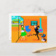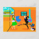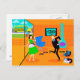 Cette Carte postale de Parents rétro heureux montre une mère et un père se réjouissant que leur enfant fasse un trait pour le bus scolaire. Le duo de célébration est dans leur style années 60, moderne du milieu du siècle, salon. La décoration orange est tout sauf sobre. Cheminée à cône turquoise, chaise d'oeuf bleu vif contre mur en pierre orange. Sur le mur, vous trouverez l'impression en toile Stretched Art Moderne du milieu du siècle, disponible au magasin Zazzle de StrangeLittleOnion. Au sol, il y a un lecteur portable bleu et noir avec plusieurs albums de vinyle éparpillés à proximité. Papa, porte un costume noir avec une chemise bleu clair et une cravate bleu foncé. Il dévoile tous ses meilleurs mouvements de danse, le genre de ceux qui amèneraient des rouleaux oculaires de juniors. Maman porte une robe verte et vibrante et un tablier blanc et vif avec garniture bleue. Elle est debout devant des portes coulissantes en verre en agitant joyeusement tandis que son enfant court sur le trottoir avant vers le bus scolaire jaune qui attend. A travers les portes, on peut voir leur pelouse de banlieue parfaitement entretenue et leur proverbiale clôture blanche pour piquetage. Même l'arrière - plan est satisfait d'un ciel turquoise et des silhouettes de cèdres.