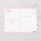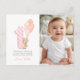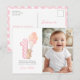 Carte de remerciement pour les invités de la fête du premier anniversaire de la petite fille avec un premier ours en peluche tenant des ballons roses.