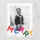 Entrez dans un monde de charme minimaliste et de joie vibrante avec ce design de carte de vacances délicieux. Contre un arrière - plan blanc propre, votre photo personnalisée brille au premier plan, capturant un moment chéri qui incarne l'esprit de la saison. De grandes lettres majuscules joueuses et audacieuses forment le mot "MERRY" sous la photo. Chaque lettre est imprégnée d'une couleur vive différente, créant un affichage visuellement frappant qui rayonne de joie festive. Les lettres colorées dansent joyeusement, invitant les récipiendaires à embrasser le plaisir et l'excitation de la saison des Fêtes. Sous la photo, dans une police sans serif classique et élégante, votre nom de famille et l'année sont gracieusement affichés en noir. Cette touche subtile ajoute une touche personnelle et intemporelle au design, faisant de cette carte un souvenir chéri.
