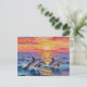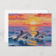 A pretty postcard with two dolphins swimming across the ocean waves at sunset done with ai in an impasto oil or acrylic style.