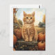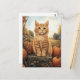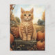 Peinture lunatique d'un chaton orange moelleux assis parmi les citrouilles sur une ferme rustique en automne.