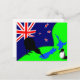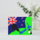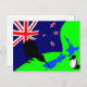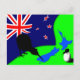 Carte postale: illustration avec motif néo-zélandais - "terre de Kiwi" avec drapeau du pays, plan, oiseau et oeuf de Kiwi.