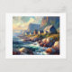 Les maisons côtières reposent sur une côte rocheuse avec des vagues qui s'écrasent contre les rochers. La scène se déroule sur fond de falaises spectaculaires et d'un ciel animé.
