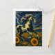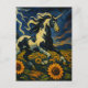 Une licorne pie galopant à travers un champ de tournesols dans un orage.