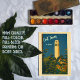 Cette illustration de carte postale encadre la tour Coit comme un phare Art déco pâle s'élevant contre un ciel crépusculaire profond. Au premier plan, un feuillage luxuriant et silhouetté déborde des deux côtés, guidant votre regard vers le haut au-delà d'un groupe de maisons de colline chaleureusement éclairées en ocre, sarcelle et orange brûlé. La tour elle-même se dresse grande et élégante au centre, ses lignes épurées contrastant avec les courbes organiques des feuilles et des toits. Au-dessus, dans un script ludique et manuscrit, on lit « Coit Tower » avec « San Francisco » juste en dessous en plus petits caractères. Tout en bas, les coordonnées précises « 37.8024°N 122.4058°W » ancrent la scène, lui donnant cette authenticité de souvenir de voyageur.