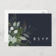 Nous avons conçu cette verdure et cette feuille d'or | dark marine mariage carte postale RSVP pour compléter votre mariage boho simple mais élégant. Il présente des feuilles modernes d'eucalyptus vert et blanc, du feuillage de fougères, une fleur succulente et un minimum de feuilles de feuille d'or. Ces éléments donnent l'impression d'une forêt enchantée d'aquarelle capricieuse, parfaite pour tout mariage bohème et rustique ! N'hésitez pas à vous customiser et à vous en servir, n'hésitez pas à consulter le reste de la collection pour trouver les produits correspondants et coordonnés !