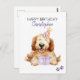 Joyeux Anniversaire avec un nom personnalisé. Une illustration mignonne de chiot Labradoodle avec un chapeau d'anniversaire et des ballons. Ajoutez votre propre message pour une carte unique personnelle. Art réalisé à l'aquarelle.