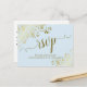 Ces belles cartes postales RSVP faciliteront la réponse de vos invités à votre faire-part de mariage. Elles présentent une élégante conception bleu et or en poudre pâle avec des calligraphies en dentelle et de jolies boucles et tourbillons en faux feuille d'or floral dans les coins. Le verso est un formulaire à remplir et à retourner par vos invités indiquant le nombre de participants et leur choix de repas. Il y a de l'espace pour entrer sur un site Web afin que vos invités puissent répondre en ligne s'ils le souhaitent. Classées et sophistiquées, ces cartes RSVP sont un merveilleux complément à votre suite d'invitations.