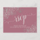 Ces magnifiques cartes postales RSVP couleur rose ou mauve vous permettront de répondre facilement à votre faire-part de mariage. Elles présentent un design élégant avec de la calligraphie en dentelle et de jolis boucles et tourbillons en fausse feuille d'argent floral dans les coins. Le verso est un formulaire à remplir et à retourner par vos invités indiquant le nombre de participants et leur choix de repas. Il y a de l'espace pour entrer sur un site Web afin que vos invités puissent répondre en ligne s'ils le souhaitent. Classées et sophistiquées, ces cartes RSVP sont un merveilleux complément à votre suite d'invitations.