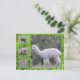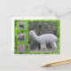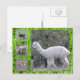 Alpaca et mouton. Sur le côté gauche de la carte se trouvent trois petites images d'alpaca (en haut et en bas) et de mouton (au centre). La majeure partie de la carte montre une image plus grande d'un alpaca blanc. Toutes les images sont encadrées par de l'herbe vert brillant avec des gouttes de rosée.
