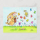 Envoyez cette jolie carte de Pâques à vos amis et à votre famille pour leur souhaiter une Pâques heureuse. Sur cette carte, un lapin de pâques beige saute de droite à gauche. Il porte sur son dos un panier d'oeufs de pâques de toutes les couleurs, qu'il dépose dans l'herbe au fur et à mesure qu'il passe. À partir de l'un de ces oeufs, un petit poussin éclose en plein vol. Ça a l'air surpris et pas trop amusé de la situation.