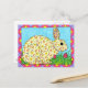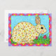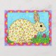 Ce petit lapin doux est recouvert de marquages multicolores de différentes formes qui rappellent ceux que l'on trouve sur les sculptures d'animaux peintes Oaxacan. Elle grignote sur un trèfle sous un ciel bleu printanier sans nuages. Toute la scène est entourée d'une frontière détaillée de style mexicain.