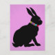 Cette carte postale a un lapin de Pâques ou Printemps assis en silhouette noire avec une couronne de jolies fleurs colorées autour du cou et un oeil rose sur un arrière - plan rose.