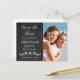 Chalkboard images are always popular, and this elegant design is no exception. Your photograph (black and white or color) is on the right side, with a pretty script silver "Save the Date" on the left. Your custom text and a chalkboard laurel leaf emblem embellished with a silver heart are also on the left. The back of the card has an additional text field if needed. All the text, front and back, is easily customized.