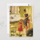1920 illustration d'une petite gourde qui s'est lavé les mains dans sa belle cuisine avec sa mère et son père. Papa est à genoux et sourit en examinant ses mains pour s'assurer de la propreté. Beau cadre familial vintage