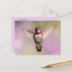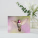 Carte postale montrant un colibri d'anna en vol contre un arrière - plan violet et vert, avec ses ailes larges ouvertes, vous regardant directement. Vous pouvez voir les détails de ses plumes de gorge rose magenta (gorget). Belle carte pour les amateurs d'oiseaux, de jardins et de nature. Photo prise à Arcadia, Californie.