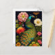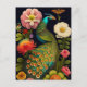 Carte postale avec un paon coloré et une variété de fleurs enchantées. Peinture numérique botanique dans un style Haeckel moderne.