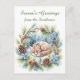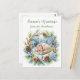 Un mignon renard dort dans une forêt enneigée entourée d'une couronne d'hiver composée de bouges de sapin, de cônes de pin, de baies et de flocons de neige.