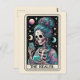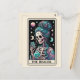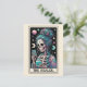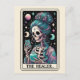 Envoyez une énergie puissante et positive avec la carte postale inspirée du Tarot 'La Guérisseuse'. Cette superbe impression d'art gothique présente une figure de squelette stylisée tenant des symboles de renouveau et de force, sur un fond cosmique sombre.
