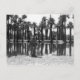 Une borne d'incendie noire et blanche est installée au bord d'un lac entouré de palmiers.