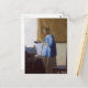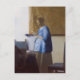 Belle peinture de la mère enceinte en haut bleu. Elle se tient près d'une fenêtre et lit une lettre. Image de Johannes Vermeer aux couleurs douces.