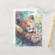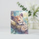 This serene and artistic design features a majestic leopard shown resting peacefully on a thick, textured tree branch. The leopard is captured in a moment of total tranquility, with its eyes closed, a soft pink nose, and delicate white whiskers. Its beautiful golden coat is covered in detailed black rosettes and spots, which contrast gently against the soft, painterly watercolor background. Beams of bright golden sunlight filter through the canopy of green and yellow leaves, illuminating the scene with a magical, hazy glow. The branch is covered in patches of soft moss and lichen, adding to the lush, natural feel of the wild habitat. The overall aesthetic is calm, warm, and filled with natural beauty, making it an exceptional choice for wildlife lovers and fans of artistic animal portraits. This peaceful leopard postcard is an ideal choice for sending a soothing "get well soon" message or a quiet note of encouragement to a friend who appreciates the grace of big cats. You might choose to use this artistic card for a safari-themed birthday invitation or as a lovely way to share a message of rest and relaxation with your family. It also makes a beautiful piece of mini-art for a home office or a calming addition to a travel journal as a small token of a jungle adventure. This versatile design is also an excellent choice for a housewarming note, a thank you message, or as a heartwarming way to share a message of joy for any situation or event.