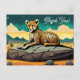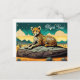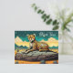 Un léopard de style dessin animé sauvage est allongé sur un rocher sur une carte postale du désert.