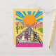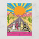 Carte postale illustrant cinq chats élégamment vêtus et portant des lunettes de soleil se promènent dans une décapotable rose à travers un paysage désertique vibrant. En toile de fond, les cactus, les montagnes et le soleil couchant rayonnent. Le style fantaisiste et pop-art évoque une ambiance ludique et rétro de road trip.