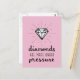 Une carte postale avec une citation en losange qui dit "les diamants sont faits sous pression" ! Cette conception utilise un écriture décontracté manuscrit et une brosse ainsi qu'une pièce en diamant pour arranger un design élégant de typographie. Envoyez cette carte de voeux d'encouragement au destinataire pour les encourager à tirer parti de sa force intérieure pour la pression et le stress qu'elle affronte va être ce qui fait d'elle un diamant!