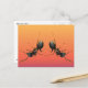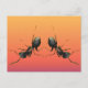 Cette carte postale présente un design fantaisiste de deux fourmis plus grandes que nature, dansant sur une surface colorée d'orange, d'or et de violet.