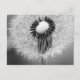 Une photo en gros plan en noir et blanc des graines de Dandelion. Certaines graines ont déjà soufflé, tandis que les graines restantes créent un cercle sur le coussin d'épingle blanche d'une tête de fleur.