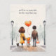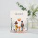 Une carte postale de retour à l'école mignonne avec l'illustration d'une mignonne écolière tenant la main de ses parents et avec le texte personnalisable par défaut "nous serons de votre côté pour le premier jour !" texte. Un chiot accompagne également la famille.