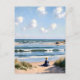 Cette scène paisible montre une femme qui est seule sur la plage et qui regarde la mer. Les vagues roulent doucement sur la côte sous un air bleu avec des nuages sombres. Les dunes encadrent l'horizon, une atmosphère intime et sereine de cette jolie terrasse de plage. Elle rêve de l'avenir et réfléchit à sa vie, peut-être en profitant d'un moment de tranquillité et d'évasion de l'agitation quotidienne. Ses pensées se détournent vers des endroits lointains et de nouvelles aventures, tout en laissant entrer en jeu l'influence apaisante de la mer.