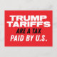 "Les tarifs sont des taxes. Nous, les consommateurs, les payons — pas le fabricant ou le pays d'origine. Ils nous sont transmis directement." L'arrière - plan est rouge. Dans la partie supérieure, les mots "TRUMP TARIFFS" sont en caractères sans-serif casquette, gras et blancs, semblables à ceux que Trump utilise souvent. Dans la moitié inférieure, l'expression "SONT UNE TAXE PAYÉE PAR LES ÉTATS-UNIS" est répartie sur deux lignes. La police n'est pas identique à "TRUMP TARIFFS", mais plus petite. Les mots "SONT UN IMPÔT" sont en noir, et "PAYÉ PAR LES ÉTATS-UNIS" sont en blanc.