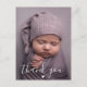 Personnalisez ces cartes de remerciement élégantes et minimalistes pour la baby shower avec une belle photo de votre bébé. Remerciez votre famille et vos amis qui vous ont comblés de leur amour et présentez votre nouveau bébé avec une image qu'ils pourront chérir pendant de nombreuses années. Les cartes présentent un lettrage manuscrit "Merci" élégant et moderne avec un petit cœur et une typographie classique avec un message de remerciement personnalisé au verso. Une merveilleuse façon de remercier vos invités à la baby shower une fois que bébé est né ! Veuillez noter que le texte manuscrit est en blanc et qu'il serait plus beau sur une photo de fond plus foncée.