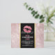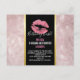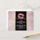 Carte de voeux d'anniversaire ou autre événement avec un fond composé de feuilles tropicales rose gold. Superposé par-dessus se trouve un cadre noir avec une bordure à dégradé doré, à l'intérieur se trouvent des lèvres roses scintillantes.