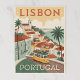 affiche vectorielle de Lisbonne, avec le quartier Alfama aux toits rouges, rues étroites et sinueuses, et le tramway jaune classique 28 en descendant une colline. Bâtiments pastel, textures carrelées (azulejos) et quelques palmiers. Utilisez des couleurs plates comme l'orange poussiéreux, turquoise et crème. Titre : "LISBON" en caractères vintages gras en haut, avec "PORTUGAL" en plus petit sans-serif en dessous.